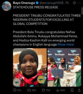 President Bola Ahmed Tinubu has applauded Nafisa Abdullah Aminu, a Nigerian student who emerged as the top performer at the 2025 TeenEagle Global Finals held in London, United Kingdom, where she outshone over 20,000 participants from 69 countries—including native English speakers.