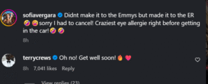 “Didn’t make it to the Emmys but made it to the ER. Sorry I had to cancel! Craziest eye [allergy] right before getting in the car!”